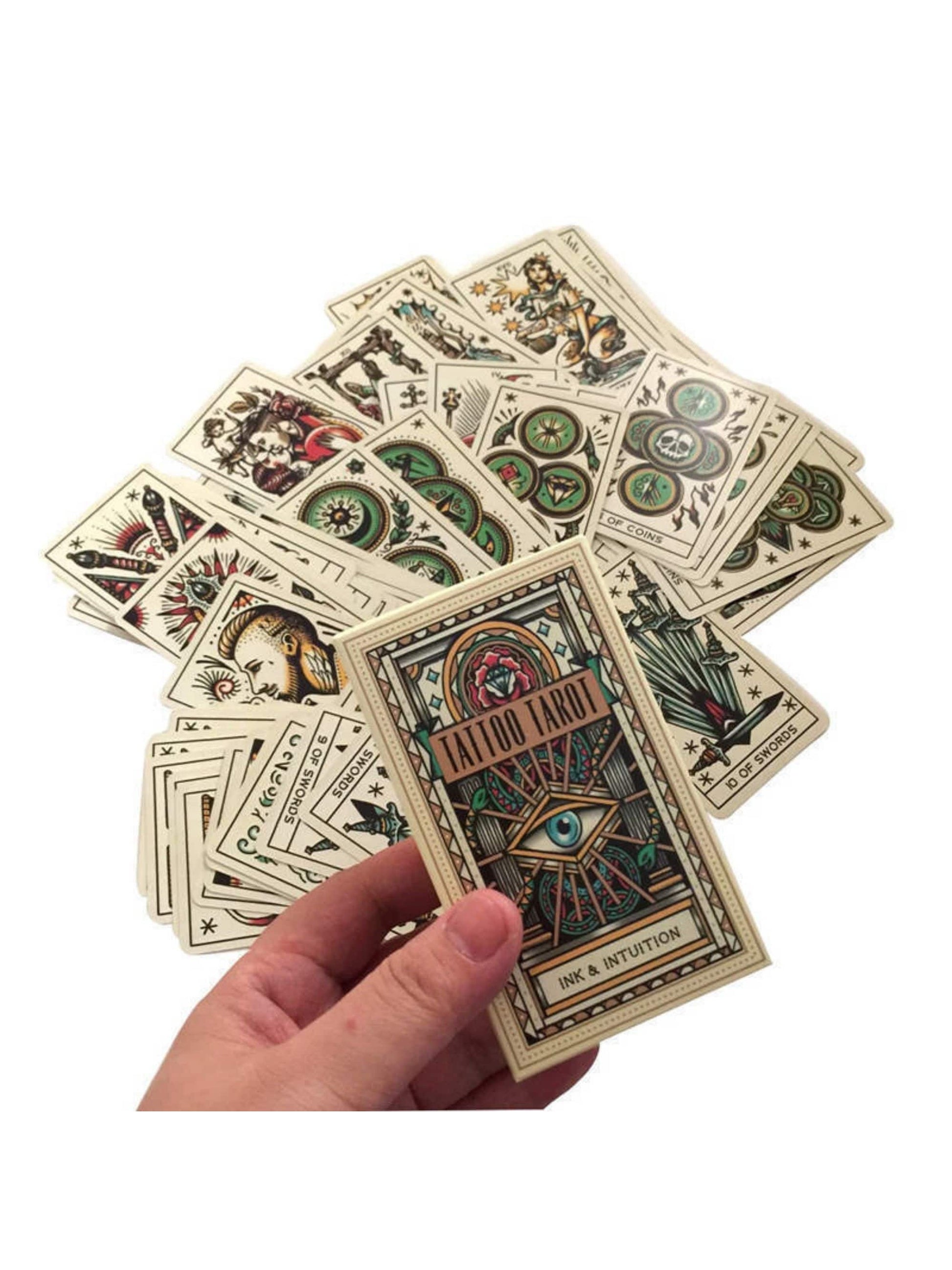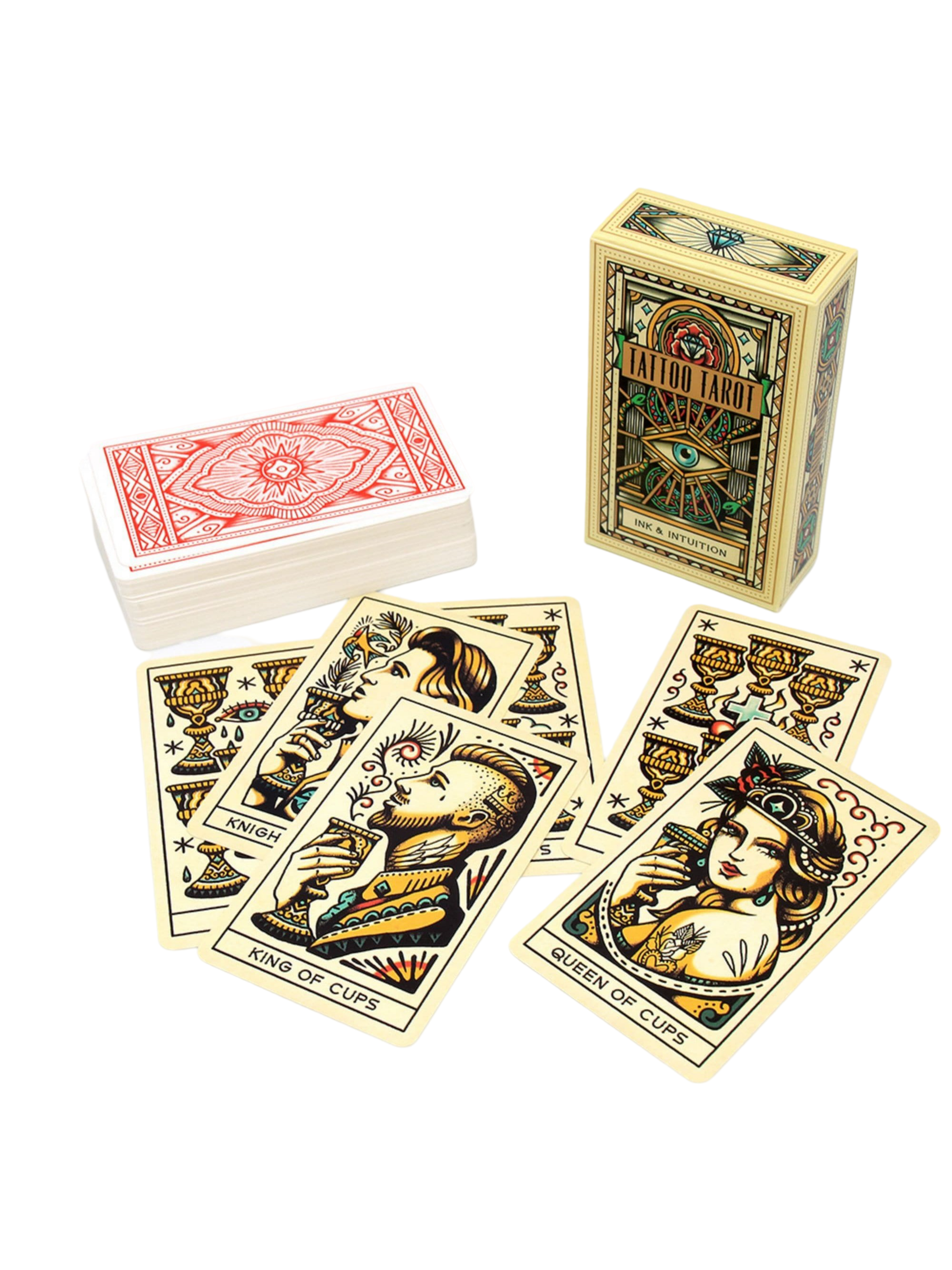 Découvrez l'univers unique du Tattoo Tarot, un jeu de 78 cartes alliant art traditionnel et divination. Chaque carte est magnifiquement illustrée avec des dessins de tatouage classiques, inspirés des styles ancestraux, vous offrant une expérience de tirage empreinte de symbolisme et de mystère.